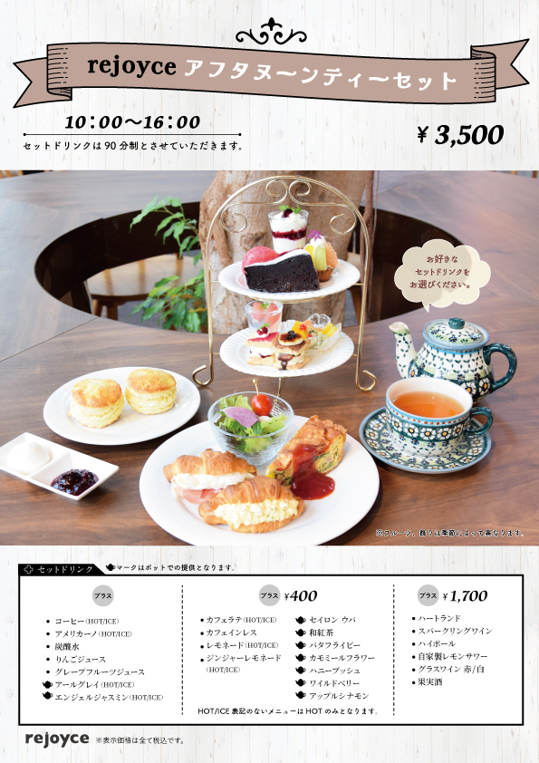 リジョイスのアフターヌーンティーセットでゆったりとした時間をお過ごしください。