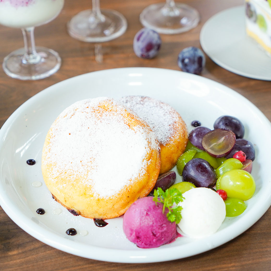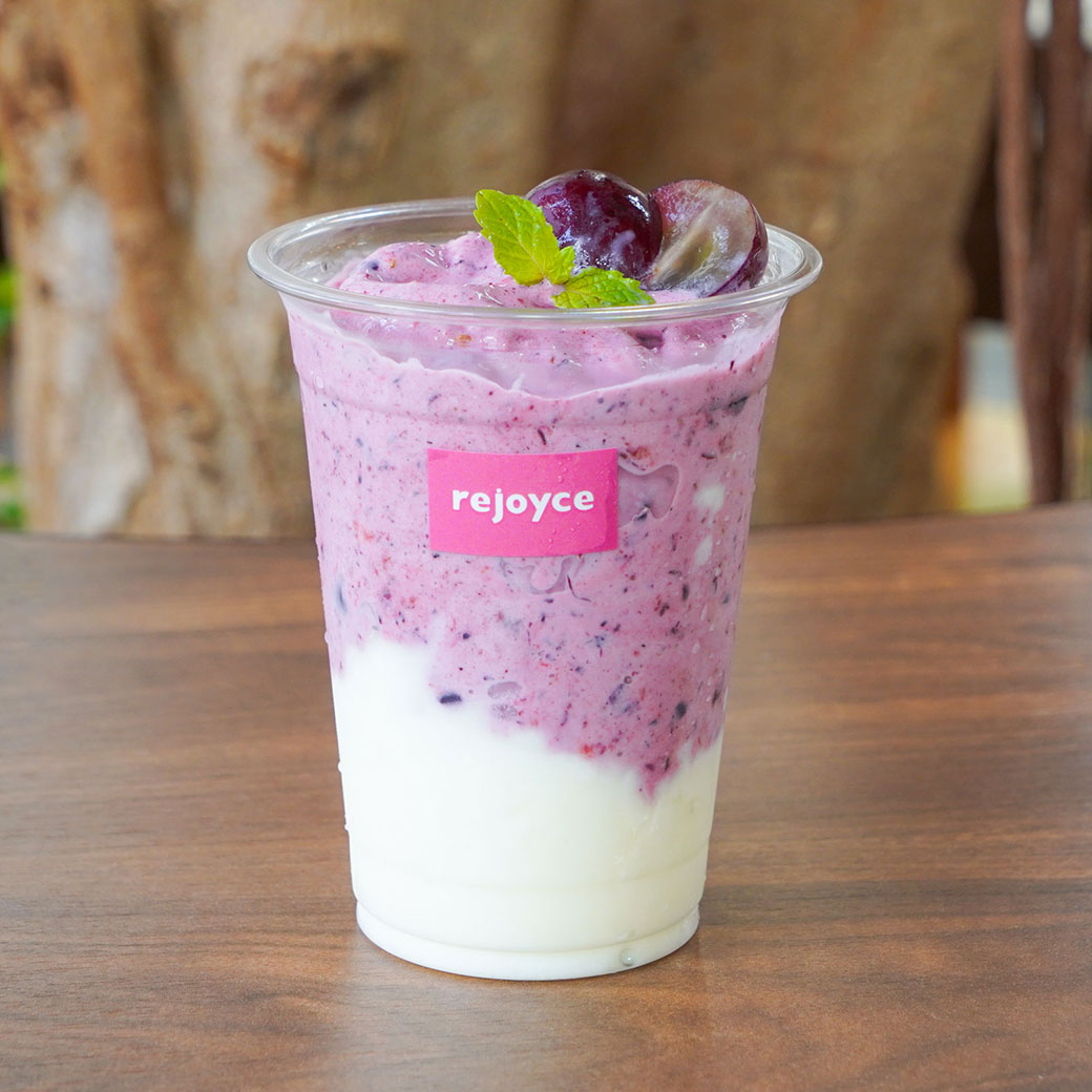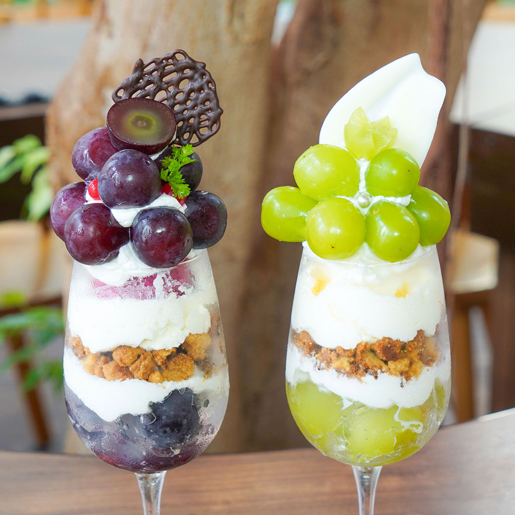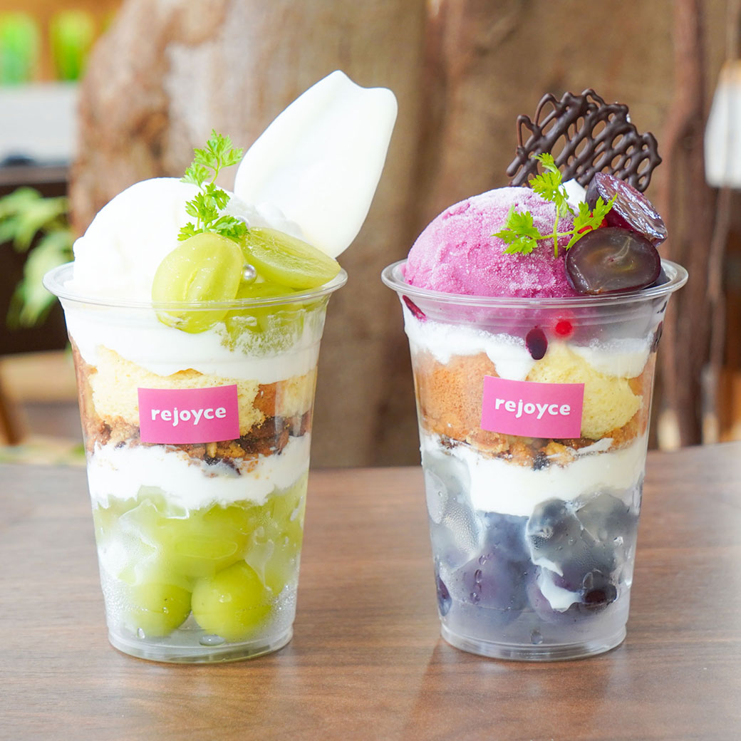 2025年9月8日 季節限定 【ぶどうフェア】旬のぶどうを2種類たっぷり使った贅沢スイーツが今年も登場! 旬のぶどうをたっぷり使った期間限定スイーツ&ドリンクが登場! ピオーネのパフェ(写真左) 皮ごと食べられ栄養価の高いピオーネをたっぷりと使いました。 レアチーズムース、濃厚な赤ぶどうジェラートで甘酸っぱい贅沢パフェ。 ※時期によりぶどうの品種が変わることがあります。 1,600円 シャインマスカットのパフェ(写真右) ぶどうの女王と呼ばれるシャインマスカットをたっぷりと使いました。 レアチーズムース、ヨーグルトジェラート、アクセントにレモンピールを使用しさっぱりと爽やかな味に。 1,600円 ごろごろぶどうのパンケーキ 当店人気のパンケーキに2種類のぶどうをごろごろ乗せました。 ※焼き上げに20分ほどお時間いただいております。 (1枚)1,600円 (2枚)1,800円 ぶどうのタルト 店内で焼き上げたタルトに自家製カスタードクリーム、2種類のぶどうを盛り付けボリューム満点! 660円 ぶどうのショートケーキ ふわふわのスポンジに2種類のぶどうと、アクセントにカシスソースを入れサンドしました。 660円 ぶどうスムージー フレッシュなぶどうをそのまま冷凍し、ミックスベリーとかけ合わせた甘酸っぱいスムージー。 下にはヨーグルトが入っているので、味の変化を楽しんでみてはいかがでしょうか? 700円 大人のアールグレイ アールグレイにそのまま冷凍したシャインマスカットがごろっとはいっており、 通常とは違う、大人のアールグレイをお楽しみください。 690円 大人のエンジェルジャスミン エンジェルジャスミンにそのまま冷凍したシャインマスカットがごろっとはいっており、 通常とは違う、フルーティーなジャスミンをお楽しみください。 670円 ▼テイクアウトメニュー シャインマスカットのパフェ(写真左) 1200円 ピオーネのパフェ(写真右) 1200円 ぶどうスムージー 750円 大人のアールグレイ 690円 大人のエンジェルジャスミン 670円 季節限定rejoyceのスイーツです。 なくなり次第終了なので、お早めにどうぞ♪ チラシはこちらから ダウンロードできます。